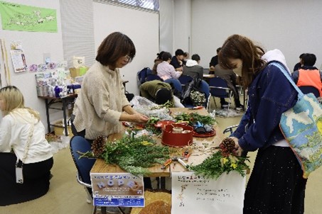 はじめに,能登里山里海SDGsマイスタープログラム運営委員長の山岸雅子理事からあいさつがあり,続いて,今年度のプログラムにおける「珠洲×地産地消・オフグリッド」をテーマとしたグループ活動の中間報告が行われました。各グループからは,本学が珠洲市で計画している実証拠点での取り組みに関して,地域活性化につなげるための具体的なアイデアが提案されました。午後は,プログラム修了生や能登地域で活動する団体・企業の関係者らによるトークセッションが行われ,里山里海とSDGsについて,多様な視点から語り合いました。また,石川県立飯田高等学校の探究チームによる活動発表や,里山里海や能登に関するポスターセッションも開催しました。さらに,プログラム修了生らによるワークショップや,里山里海に関連する商品の販売も行われ,参加者は能登ヒバを使ったリース作りを体験したり,商品を購入するなど,能登の魅力を存分に楽しみました。